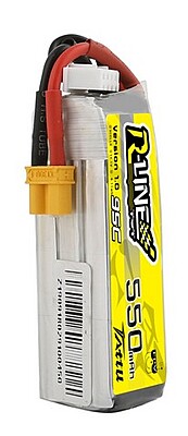 Specs: Capacity: 550mAh Voltage: 11.1V (3S) Discharge Rate: 95C burst Configuration: 3S1P Connector: XT30 Dimensions: 58 × 30 × 16 mm (±1mm) Weight: 49g (±1g) Package Includes: 1x Tattu R-Line 550mAh 3S 95C LiPo Battery